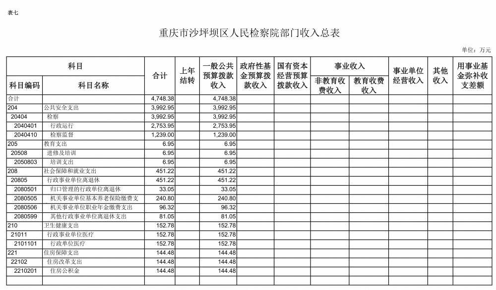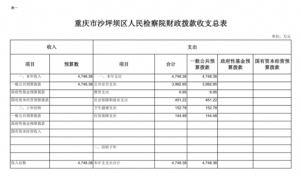 2019年一般公共预算财政拨款收入4748.38万元,一般公共预算财政拨款支出4748.38万元,比2018年减少464.74万元。其中:基本支出3509.38万元,比2018年减少316.74万元,主要原因是国家监察体制改革人员划转相关支出预算减少,主要用于保障在职人员工资福利及社会保险缴费、离休人员离休费及生活补助,保障部门正常运转的各项商品服务支出;项目支出1239万元,比2018年减少148万元,主要原因是国家监察体制改革人员划转及检察业务项目支出减少,主要用于办案费、办公设备购置及其他项目支出等重点工作。