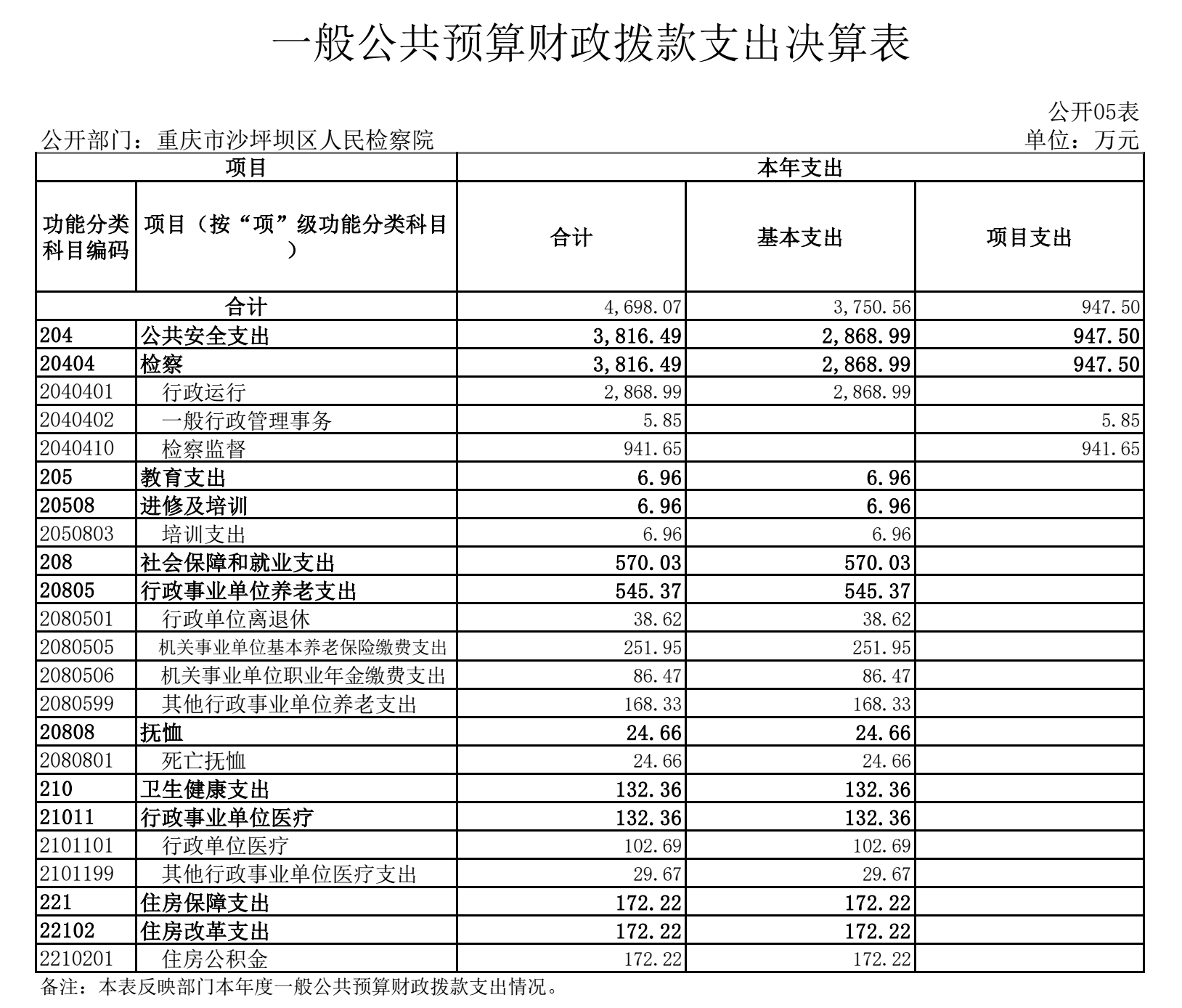 2.支出情况。2022年度一般公共预算财政拨款支出4,698.07万元,较上年决算数减少310.23万元,下降6.2%。主要原因是行政参公单位公用经费综合定额人均压减1万元,减少检察公开听证室信息系统的建设项目。较年初预算数增加471.99万元,增长11.2%。主要原因是规范公务员津贴补贴改革后,年中追加公务员基础绩效奖、年度考核奖、养老保险、职业年金和住房公积金等。
