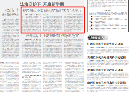 2023年2月10日,《检察日报》第2版刊登《校园周边小卖铺里的“低俗零食”不见了》一文,内容如下:
