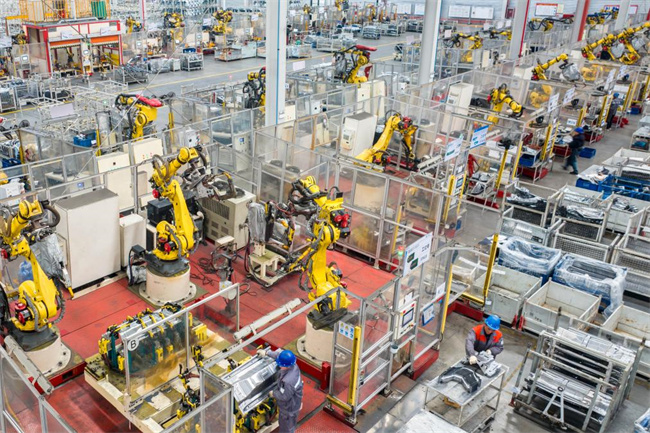 2025年2月5日,浙江省湖州市长兴经济技术开发区长兴地通汽车部件有限公司技术人员操控工业机器人生产新能源汽车配件(无人机照片)。新华社发(谭云俸 摄)