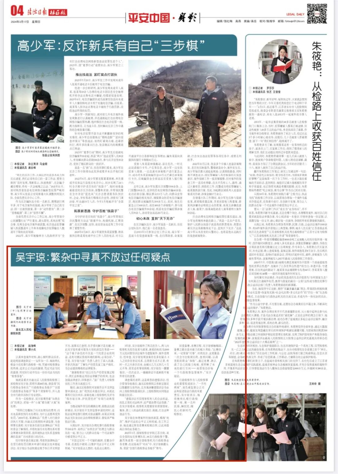 2024年3月17日,《法治日报》第4版刊登《吴宇琼:繁杂中寻真不放过任何疑点》一文,内容如下: